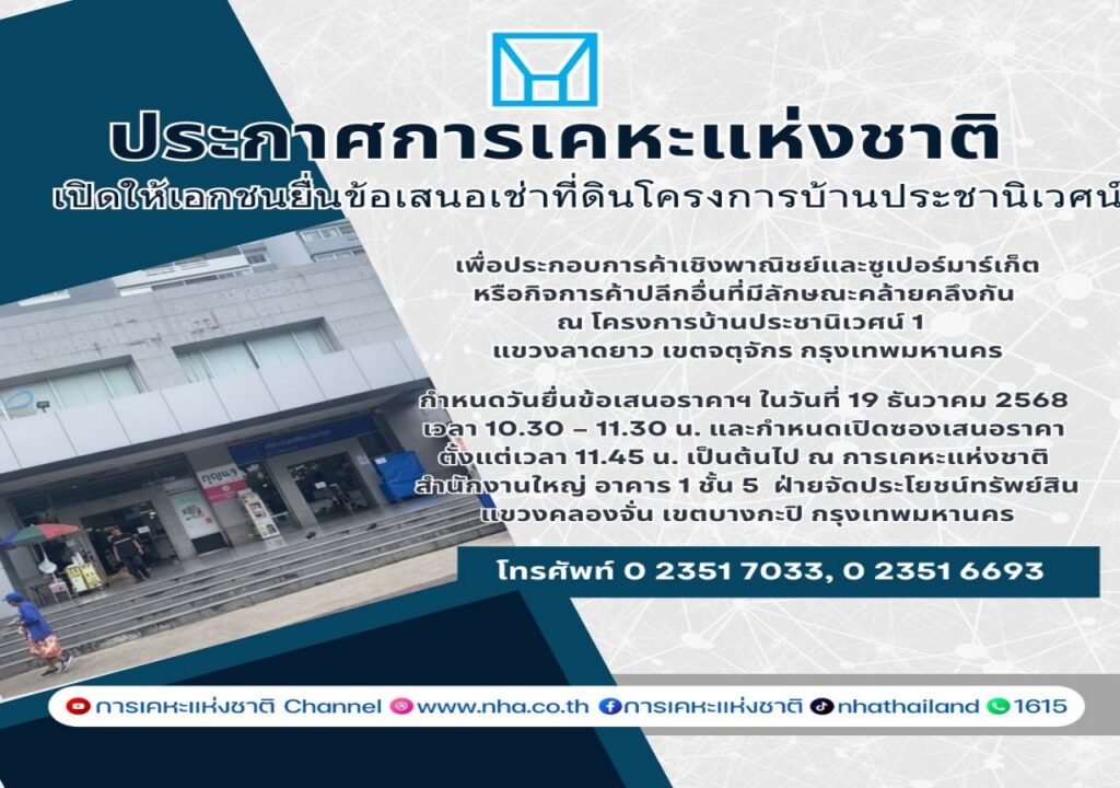 นายอรรคพล ภิรมย์ประดิษฐ์ ผู้อำนวยการฝ่ายจัดประโยชน์ทรัพย์สิน กล่าวว่า การเคหะแห่งชาติประกาศเปิดให้เอกชนยื่นข้อเสนอราคาการได้สิทธิเช่าพื้นที่ส่วนพาณิชยกรรม บริเวณชั้น 1 เพื่อประกอบการค้าเชิงพาณิชย์และซูเปอร์มาร์เก็ต หรือกิจการค้าปลีกอื่นที่มีลักษณะคล้ายคลึงกัน โครงการบ้านประชานิเวศน์ 1 โฉนดเลขที่ 2199 ขนาดเนื้อที่ประมาณ 1-0-75 ไร่ ตั้งอยู่บริเวณซอยเทศบาลนิมิตเหนือ 8 แขวงลาดยาว เขตจตุจักร กรุงเทพมหานคร เพื่อให้เกิดความโปร่งใส ในการดำเนินงานทุกขั้นตอนตามหลักธรรมาภิบาล