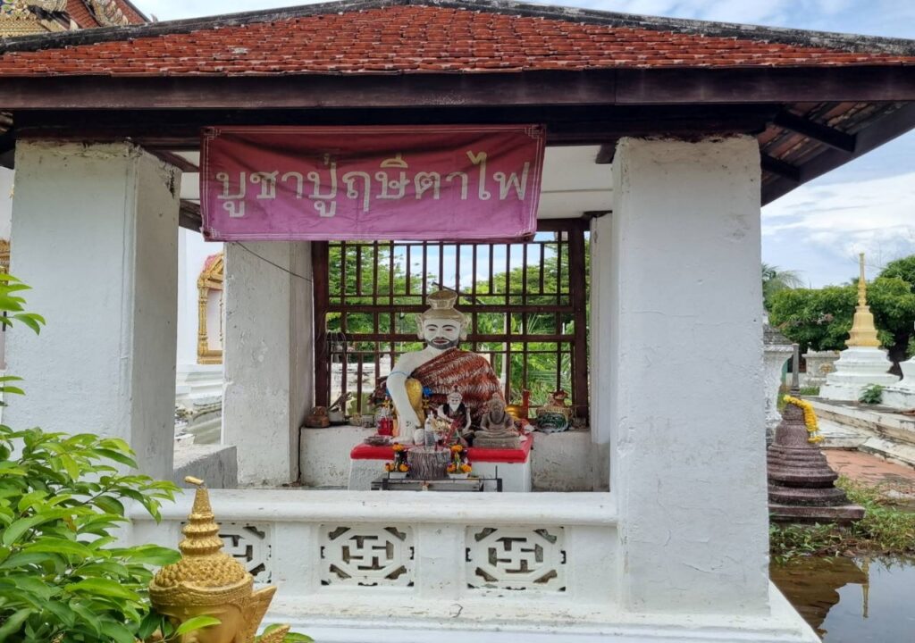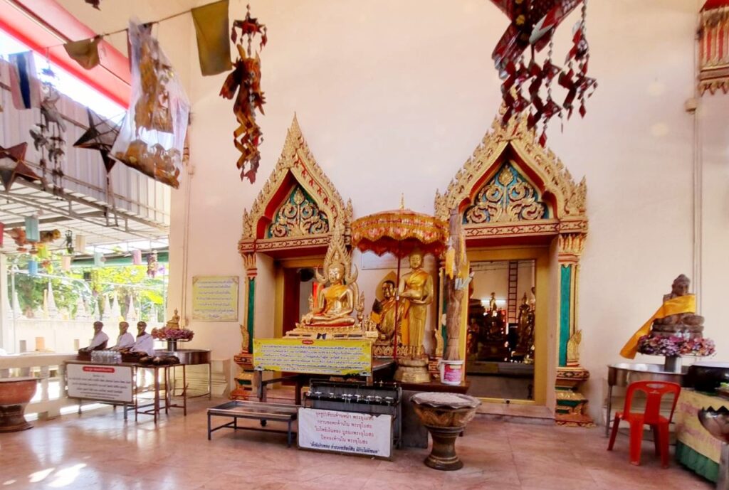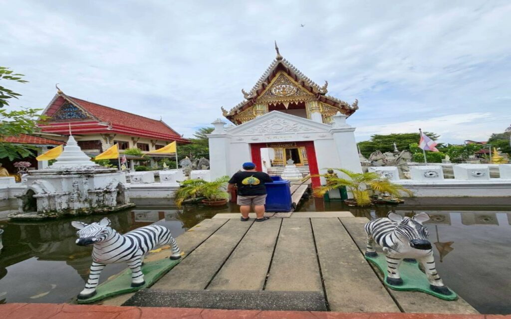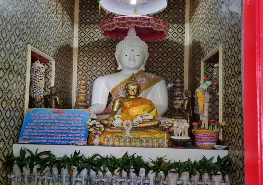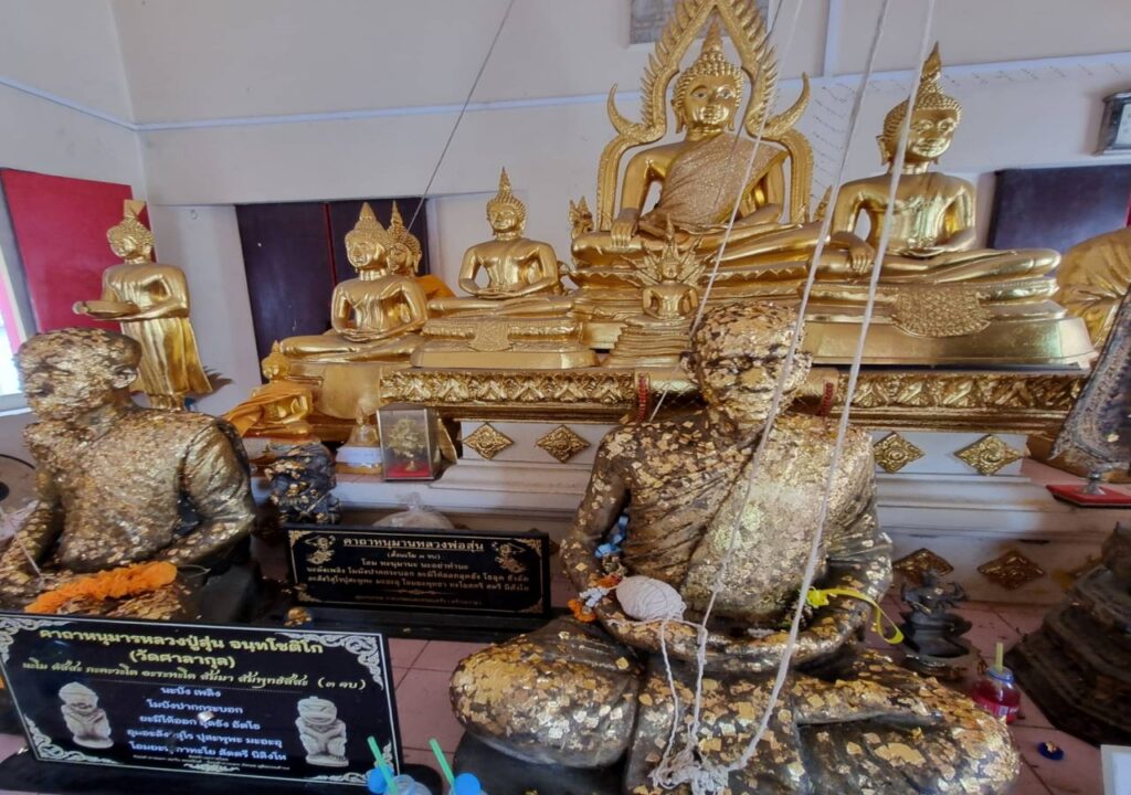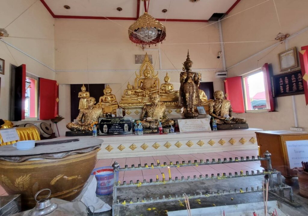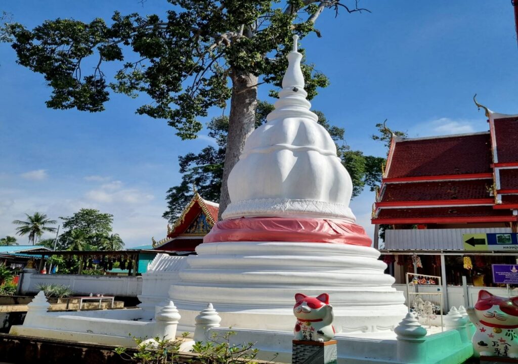 ปิดท้ายในการไปเยือนวัดเสาธงทอง สร้างเมื่อพ.ศ. 2313 เดิมชื่อ ‘วัดสวนหมาก’ มีพระประธานเก่าแก่ปางมารวิชัย มีพระเจดีย์ย่อมุมไม้ 20 พระเจดีย์ระฆังคว่ำ พระเจดีย์กลีบมะเฟืองอวบ จะเรียกว่าองค์สุดท้ายของโลก ก็ว่าได้ และบ่อน้ำหลวงตากลับ รวมถึงต้นยางอายุ 200 ปี ได้มีนักท่องเที่ยวผู้ศรัทธามาสักการะบูชาเป็นจำนวนมากไม่ขาดสาย