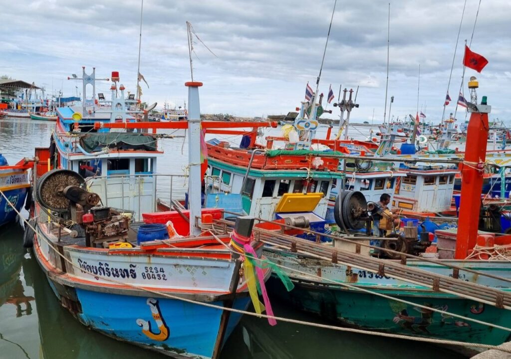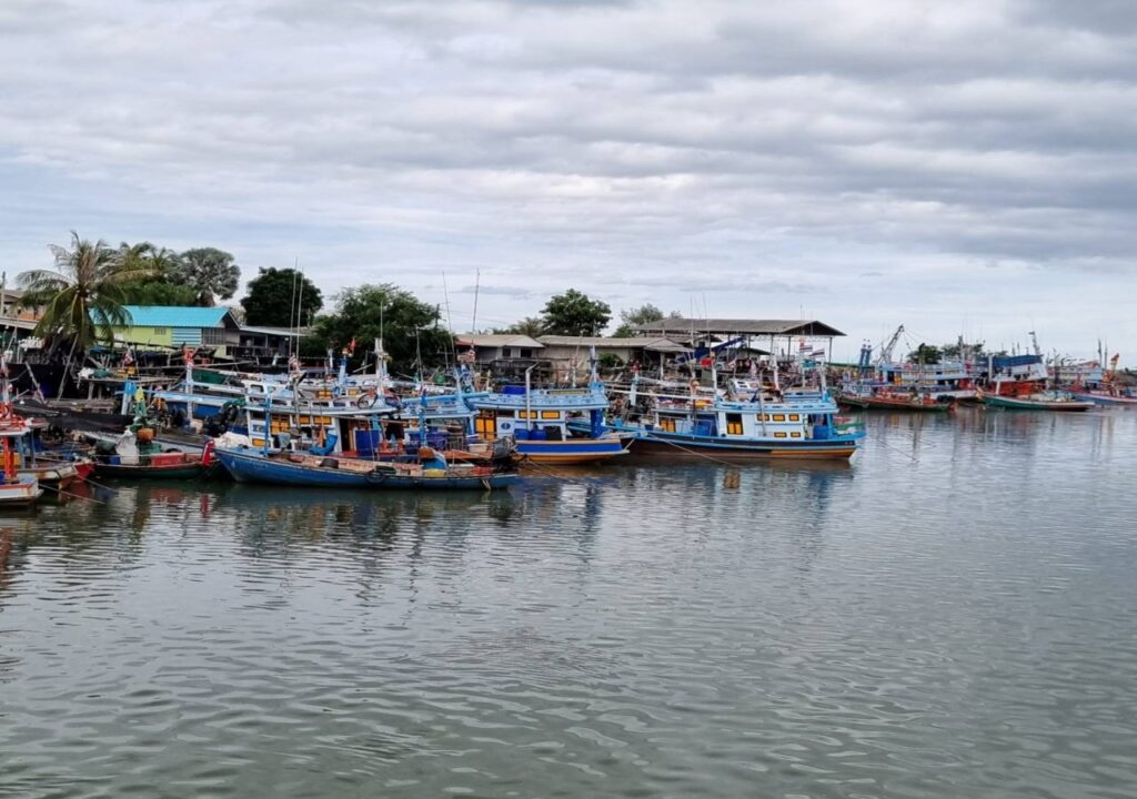 เรือประมงพื้นบ้านเรียงราย ริมสะพานเหล็กสีเหลือง
