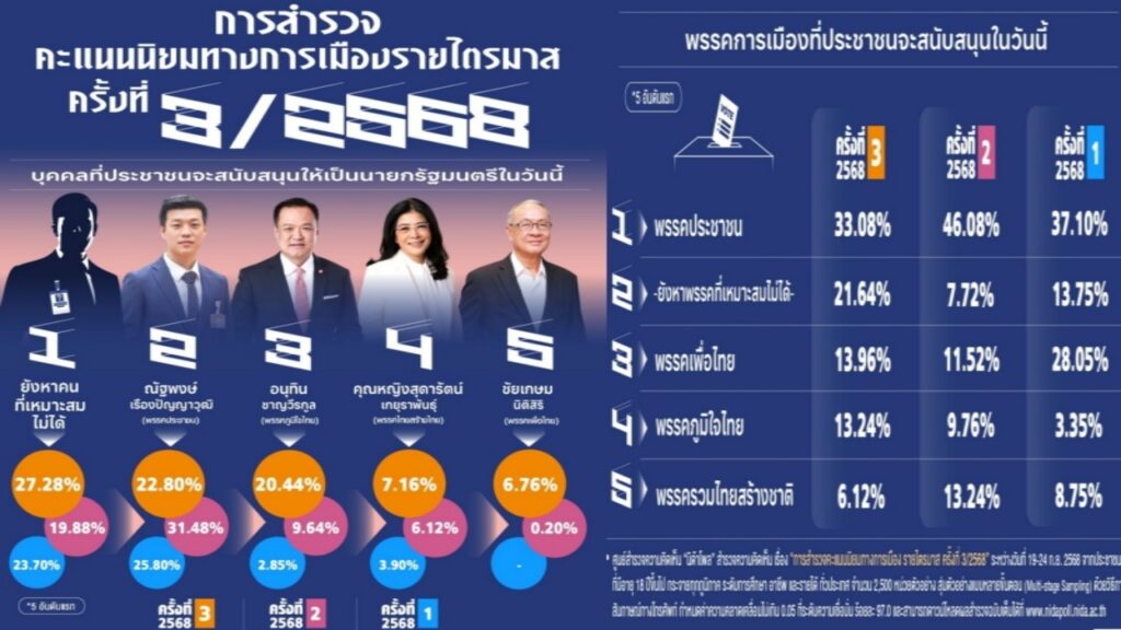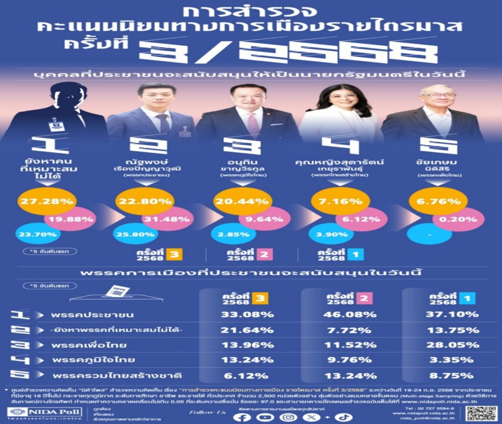 ศูนย์สำรวจความคิดเห็น “นิด้าโพล” สถาบันบัณฑิตพัฒนบริหารศาสตร์ (นิด้า) เปิดเผยผลการสำรวจ เรื่อง “การสำรวจคะแนนนิยมทางการเมืองรายไตรมาส ครั้งที่ 3/2568” ระหว่างวันที่ 19-24 กันยายน 2568 จากประชาชนที่มีอายุ 18 ปีขึ้นไป กระจายทุกภูมิภาค ระดับการศึกษา อาชีพ และรายได้ ทั่วประเทศ รวมจำนวนทั้งสิ้น 2,500 หน่วยตัวอย่าง เกี่ยวกับคะแนนนิยมทางการเมือง