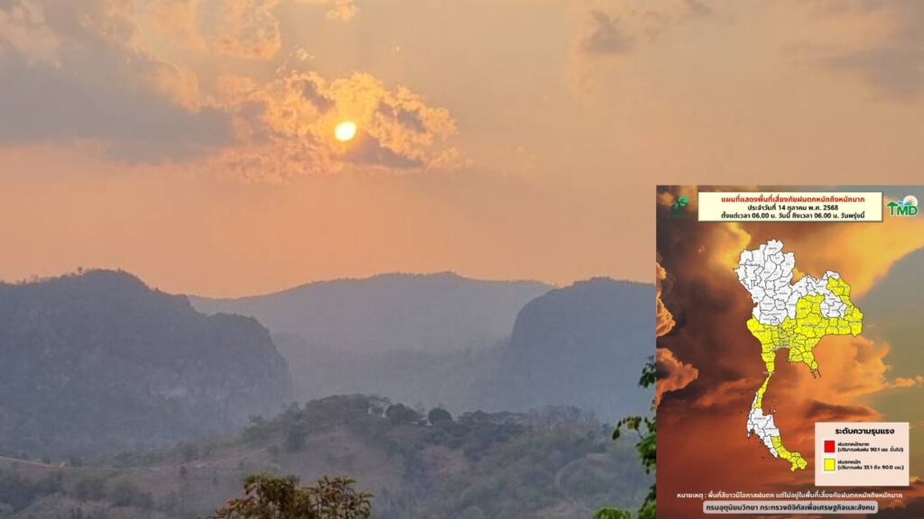 สภาพอากาศช่วงปลายฝนต้นหนาว ตั้งวันที่ 14-16 ต.ค. 2568 ประเทศไทยยังมีฝนเพิ่มขึ้น ตกกระจายและตกหนักบางแห่ง จากหย่อมความกดอากาศต่ำปกคลุมและร่องมรสุมจะเลื่อนลงมาพาดผ่านบริเวณภาคกลางตอนล่าง ภาคใต้ตอนบน ทิศทางลมแปรปรวน ต้องระวังฝนฟ้าคะนอง ฝนตกหนักและฝนตกสะสม จากนั้นวันที่ 17-23 ต.ค. จะมีมวลอากาศเย็นแผ่ลงมาปกคลุมทางตอนบนของไทย บริเวณภาคเหนือ ภาคอีสานตอนบน
