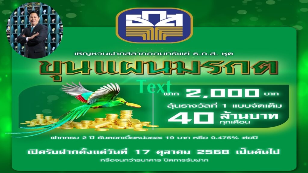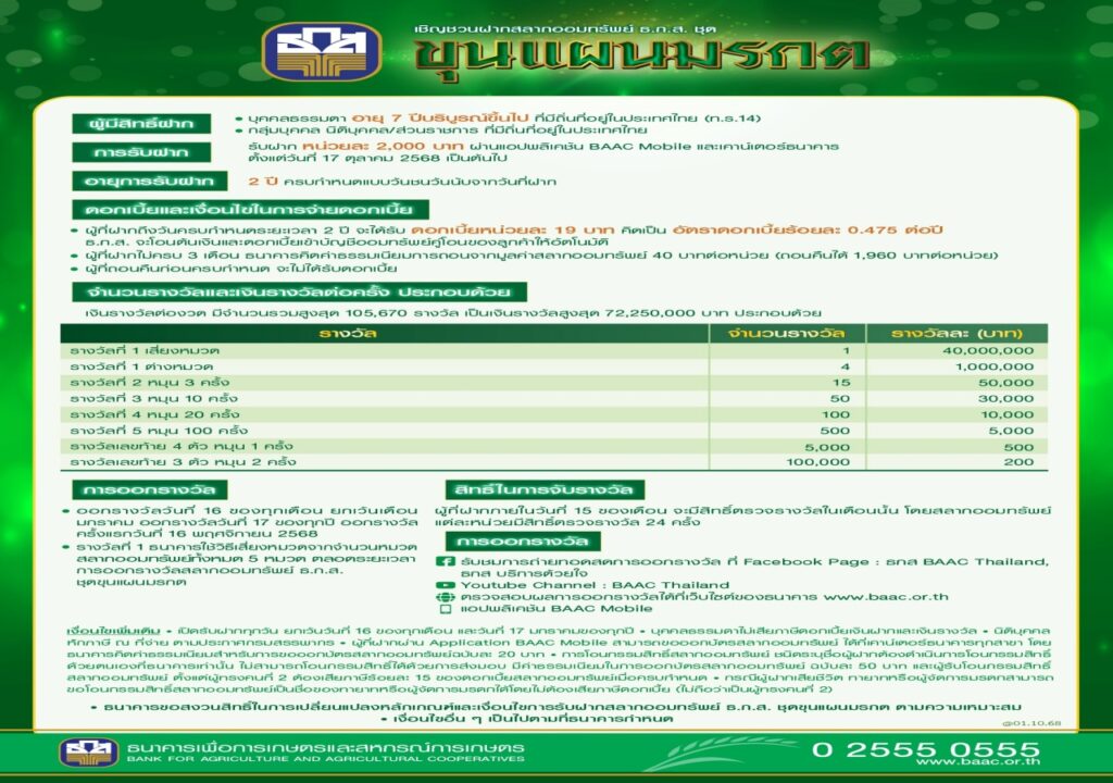 ธ.ก.ส. เปิดตัว “สลากออมทรัพย์ ธ.ก.ส. ชุดขุนแผนมรกต” หน่วยละ 2,000 บาท ลุ้นโชคใหญ่ทุกเดือน มูลค่า 40 ล้านบาท และรางวัลอื่น ๆ จำนวน 1 แสนรางวัล รวมมูลค่ากว่า 72 ล้านบาท ต่อเดือน ถึง 24 ครั้ง แบ่งเป็น 5 หมวด หมวดละ 10 ล้านหน่วย จำนวน 100,000 ล้านบาท เมื่อฝากครบ 2 ปี ได้รับดอกเบี้ยทันที หน่วยละ 19 บาท หรือคิดเป็น 0.475% และฝาก 1,000 หน่วยขึ้นไป การันตีถูกรางวัลทุกงวด ดอกเบี้ยและเงินรางวัลสำหรับบุคคลธรรมดาได้รับการยกเว้นภาษี เปิดรับฝากวันที่ 17 ตุลาคมนี้ ผ่านแอปพลิเคชัน BAAC Mobile และ ธ.ก.ส. ทุกสาขา