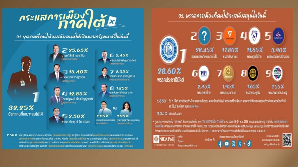 นิด้าโพล เผลผลสำรวจกระแสการเมืองภาคใต้ พบว่า พรรคประชาธิปัตย์ ยังมาแรง แต่คนส่วนใหญ่ 32.25% ชี้ยังไม่มีบุคคลเหมาะสมเป็นนายกฯ และอีก 25.65% ระบุ อภิสิทธิ์ เวชชาชีวะ เหมาะสม รองลงมา 15.40% ระบุอนุทิน ชาญวีรกูล