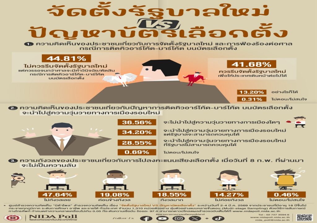 ศูนย์สำรวจความคิดเห็น “นิด้าโพล” สถาบันบัณฑิตพัฒนบริหารศาสตร์ (นิด้า) เปิดเผยผลการสำรวจ เรื่อง “จัดตั้งรัฐบาลใหม่ VS ปัญหาบัตรเลือกตั้ง” ทำการสำรวจระหว่างวันที่ 2-4 มีนาคม 2569 จากประชาชนที่มีอายุ 18 ปีขึ้นไป กระจายทุกภูมิภาค ระดับการศึกษา อาชีพ และรายได้ ทั่วประเทศ รวมจำนวนทั้งสิ้น 1,310 หน่วยตัวอย่าง เกี่ยวกับความคิดเห็นของประชาชนต่อประเด็นการจัดตั้งรัฐบาลใหม่และปัญหาบัตรเลือกตั้งหลังการเลือกตั้ง