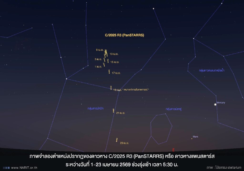 นายศุภฤกษ์ คฤหานนท์ ผู้ช่วยผู้อำนวยการสถาบันวิจัยดาราศาสตร์แห่งชาติ (สดร.) กล่าวว่า ในช่วงเดือนเมษายน 2569 จะมีดาวหางที่น่าจับตา และอาจจะสว่างจนมองเห็นด้วยตาเปล่า จำนวน 2 ดวง ได้แก่ ดาวหางแม็ปส์ หรือ C/2026 A1 (MAPS) คาดว่าจะสว่างที่สุดต้นเดือนเมษายนนี้ และ ดาวหางแพนสตาร์ส หรือ C/2025 R3 (PanSTARRS) คาดว่าจะสว่างที่สุดช่วงหลังสงกรานต์