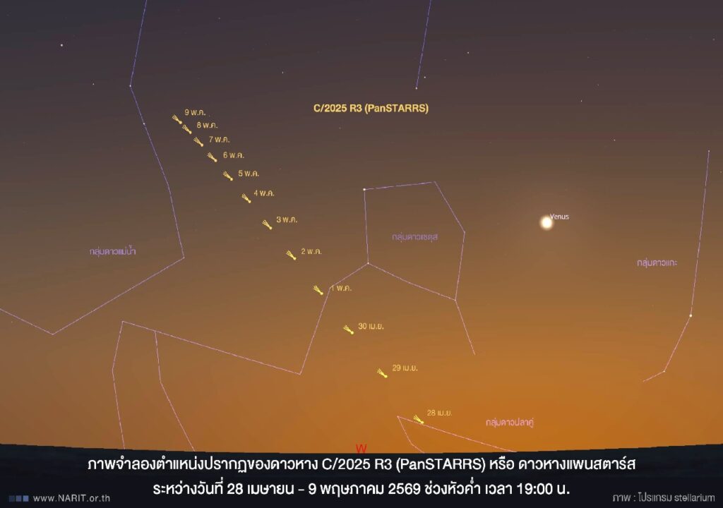 ส่วนดาวหาง C/2025 R3 (PanSTARRS) เป็นดาวหางที่คาดว่า มีต้นกำเนิดจากเมฆออร์ต (Oort cloud) ซึ่งเป็นพื้นที่เปลือกนอกสุดของระบบสุริยะที่เต็มไปด้วยวัตถุจำพวกน้ำแข็ง โดยดาวหางแพนสตาร์ส จะเฉียดเข้าใกล้ดวงอาทิตย์ในวันที่ 19 เมษายน 2569 และจะโคจรเข้าใกล้โลกที่สุดวันที่ 26 เมษายน 2569 ห่างประมาณ 73.2 ล้านกิโลเมตร คาดว่าจะมีค่าอันดับความสว่างปรากฏประมาณ 4 สามารถมองเห็นได้ด้วยตาเปล่าในพื้นที่ที่ไร้แสงรบกวน สว่างใกล้เคียงกับดาวหางเลมมอน ในปี 2568